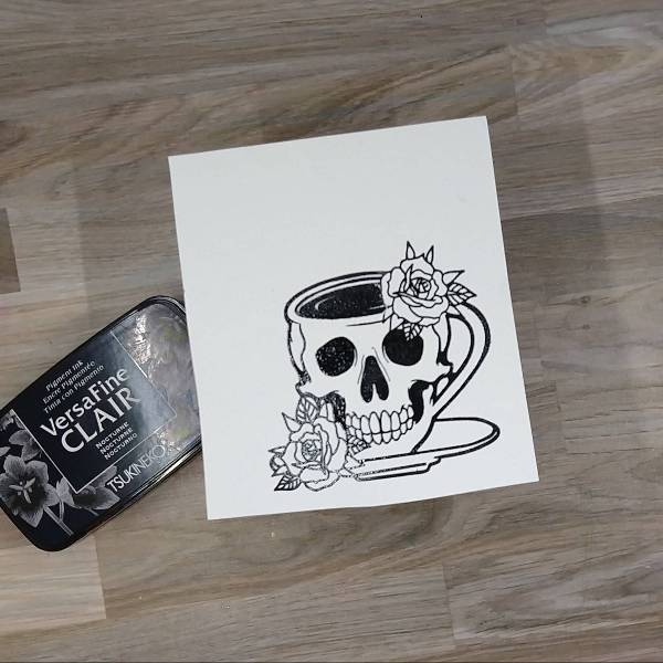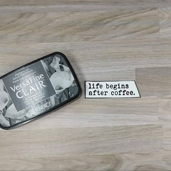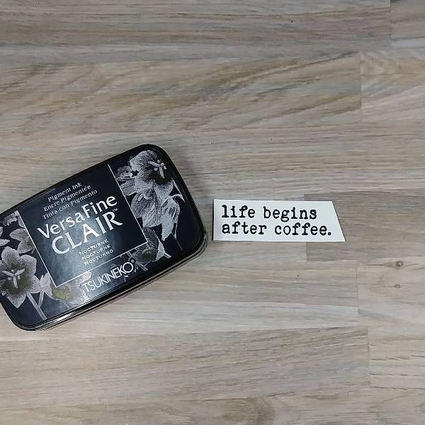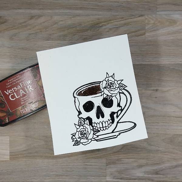 Remove the masking paper. Stamp the coffee in the cup with Acorn VersaFine Clair ink. (I