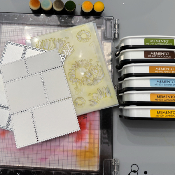 Directions: Gather your supplies. You will need several colors of ink, I used Memento inks. I used a layering stencil by The Ton and a postage stamp set also by The Ton