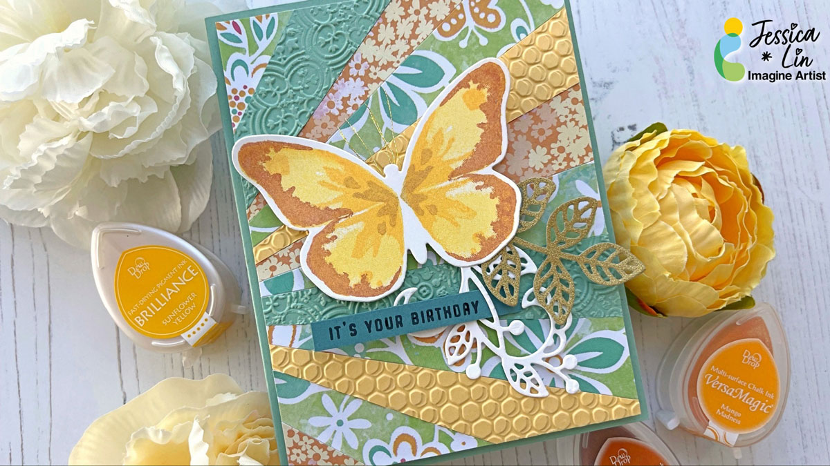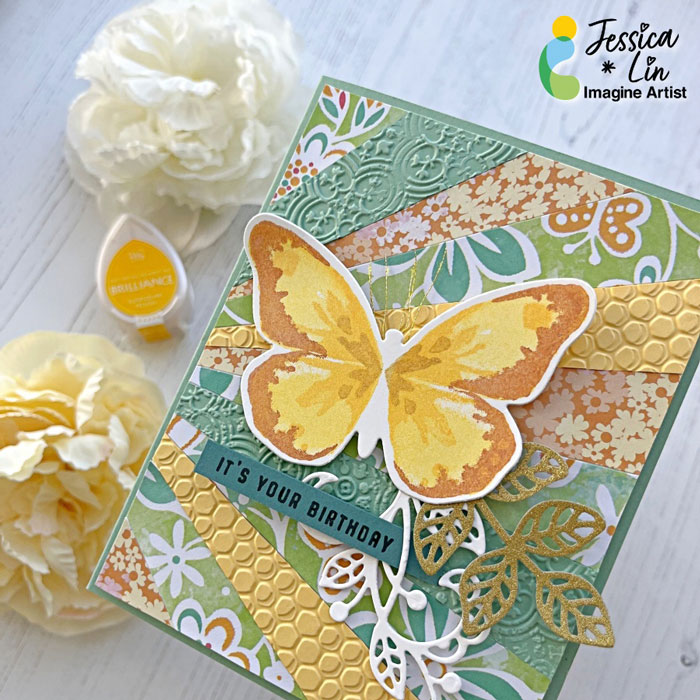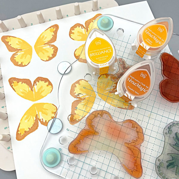 The focal image of today’s card is this butterfly stamp from Watercolor Wings. It’s one of my favorite layering stamp sets of all time. I used Brilliance Sunflower Yellow for the base layer. Then I stamped the second and third layers with VersaMagic Mango Madness and Pumpkin Spice. I did add a fourth layer using Brilliance Galaxy Gold as well (not pictured).