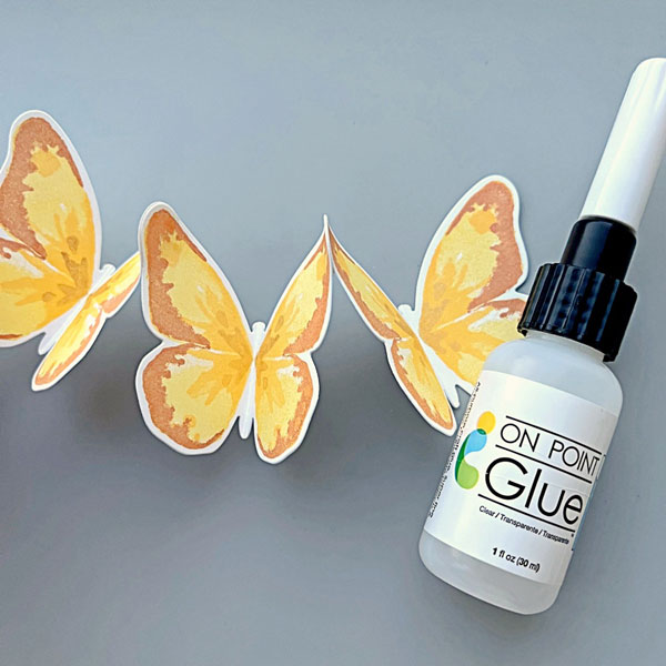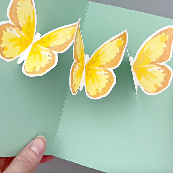 Die cut the butterfly images with Bold Butterfly dies. Then adhere the tips of the butterfly die cuts with On Point Glue. This would create a string of butterflies for a surprise pop up mechanism inside the card (next photo).