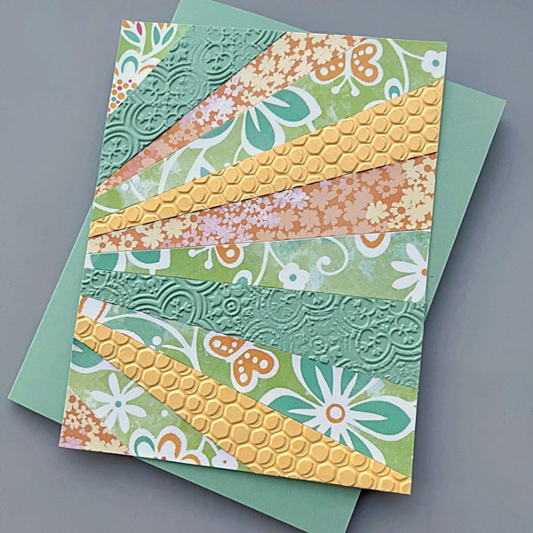 To make the patterned paper background for the card front, trim your patterned paper scraps to 1 x 6’’. Then cut each piece diagonally to create long, triangular shapes. I used Stick It adhesive to cover the entire background panel and adhered the patterned paper pieces on top. However, you could use whichever adhesive you prefer. Once the entire panel is covered, trim off the hanging pieces on the edges.