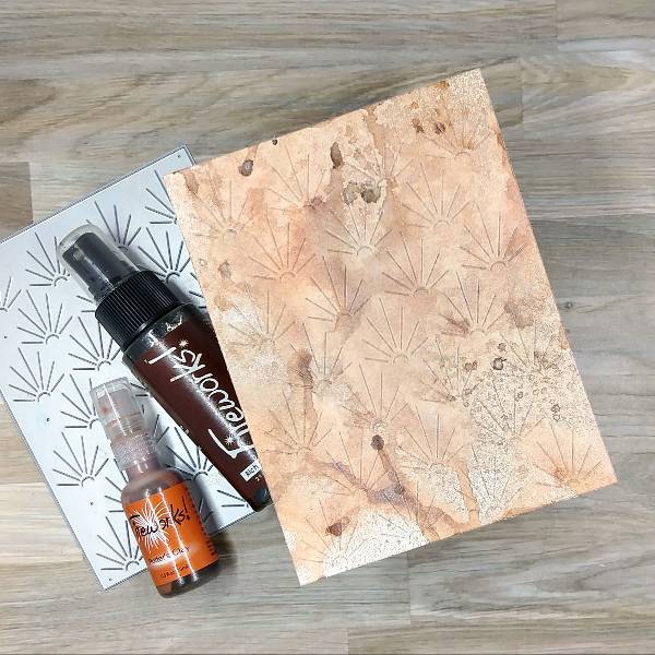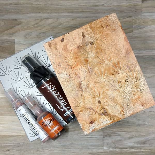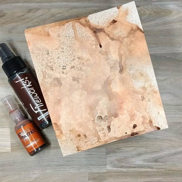 Spray a piece of watercolor paper with Rich Cocoa and Potter’s Clay Fireworks! Spray.