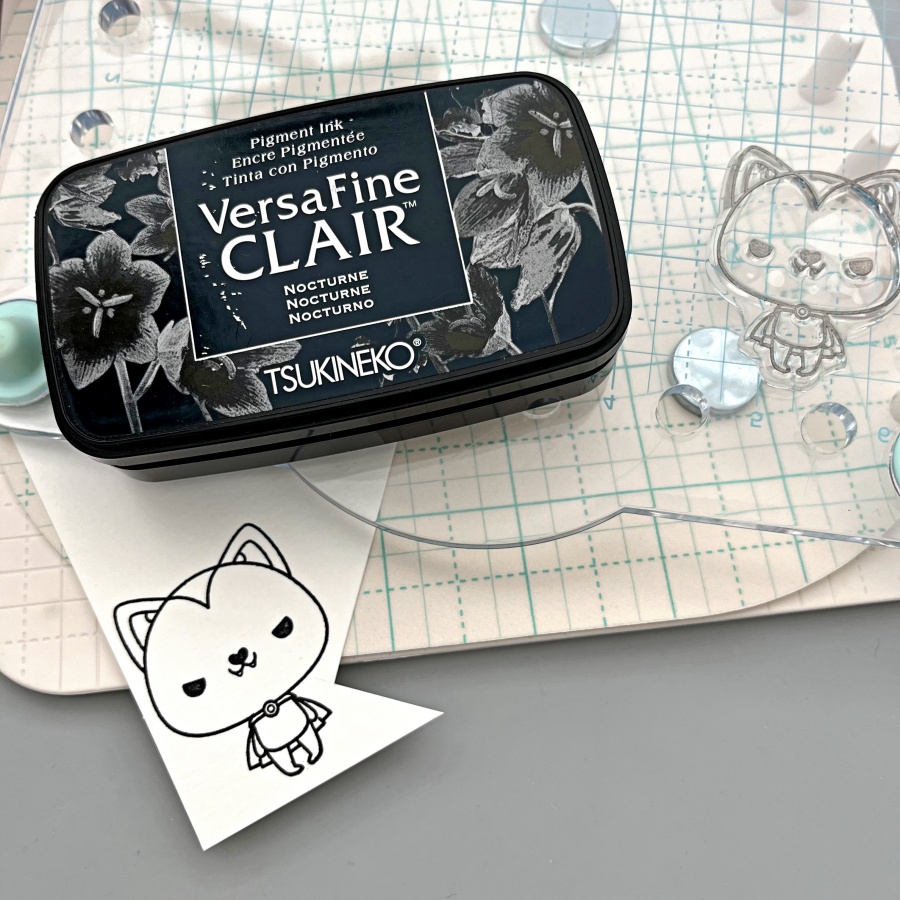 Stamp the cute Vampire image from Mama Elephant’s Meowlloween stamp set. I want to watercolor the image today so I used VersaFine Clair ink with watercolor cardstock.