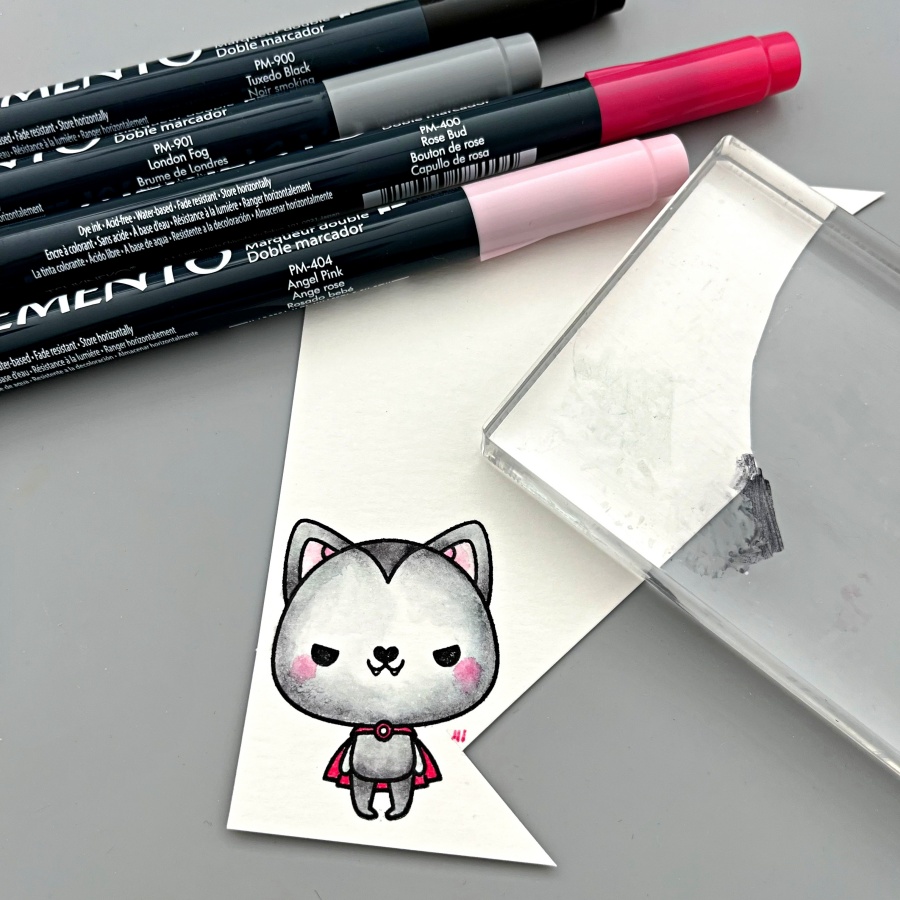 Color the image with Memento markers and a water brush. I scribbled the ink on an acrylic block and picked up colors with my water brush, but you could totally use the craft mat as the paint palette. The colors I used today are Angel Pink, Rose Bud, London Fog and Tuxedo Black. These four colors are actually sold in a set as well called Girls’ Night Out. For full color saturation, you can draw directly onto the paper. I used the fine tip end of the Rose Bud Memento marker to color in the cape. (You can see the fine lines beside the image when I was testing out the color). After coloring, I fussy cut the image with my scissors.