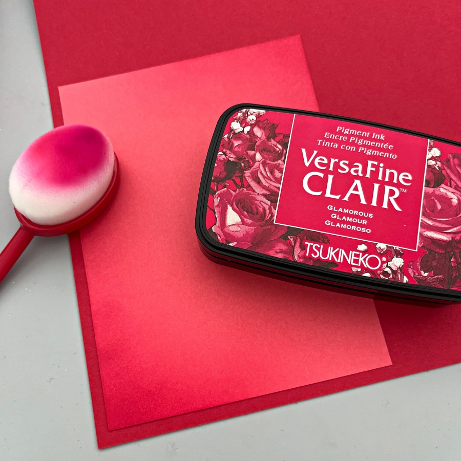 Since the background is plain and simple, I decided to ink blend the top right and bottom left corners of the card front. Versafine Clair Glamorous is the perfect shade and you can see the difference between the ink-blended and non ink-blended corners.
