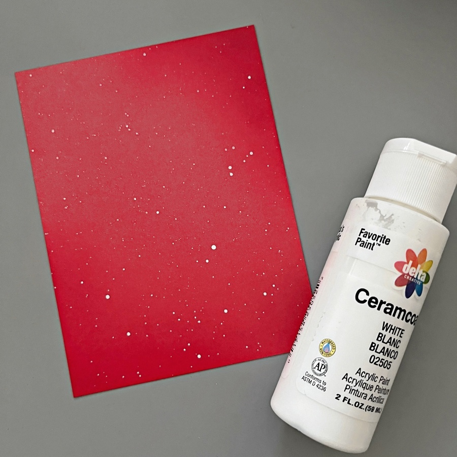 Ink splatters is the secret to elevate a card quickly. I splattered white acrylic paint across the card front to add more interest to the background.