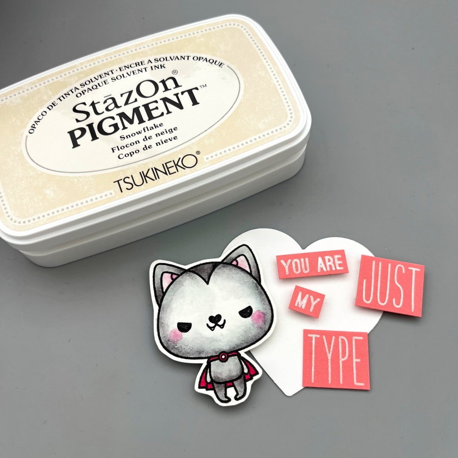 Finally, I stamped the sentiment with StazOn Pigment Snowflake ink. I used words from several stamp sets and built my own using Lawn Fawn’s Milo’s ABCs as well.