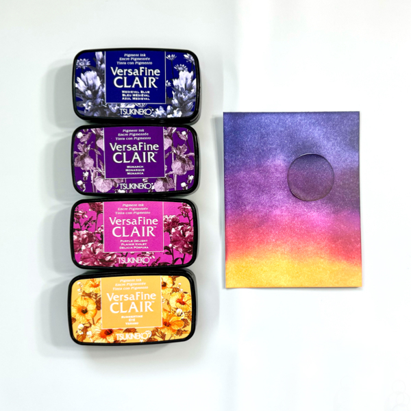 Start adding each color on the cardstock using a blending brush one by one. Colors I used for this background are VersaFine Clair: Medieval Blue, Monarch, Purple Delight, and Summertime. You can repeat adding colors until you are happy with the blended colors.