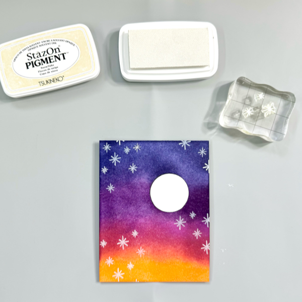 Next step is randomly stamping the small star images on the background using the Snowflake Staz-On Pigment Ink Pad. This white pigment ink is opaque and the white ink sits on top of other colors.