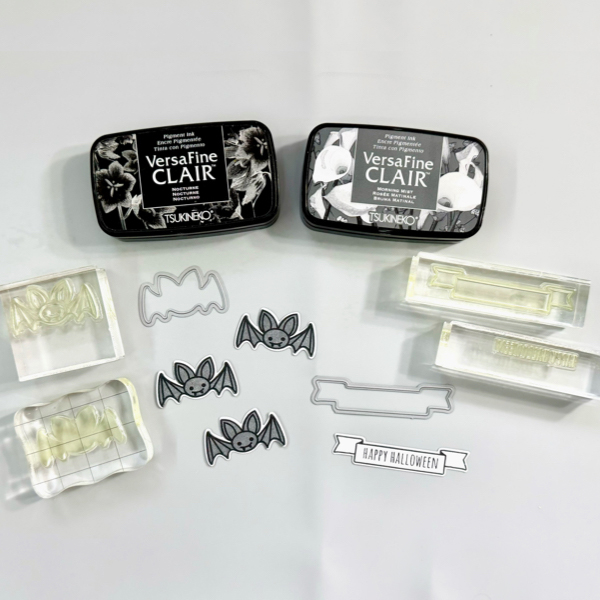 Put the bat solid stamp in the stamping block and add some VersaFine Clair Morning Mist ink pad on it, line up the bat solid stamp on top of the stamped bat image, and stamp.