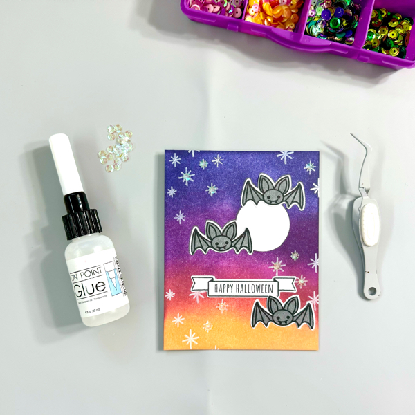 Add the background mat to the card base with some of the On Point Glue. Press firmly for a few seconds until the glue dries.