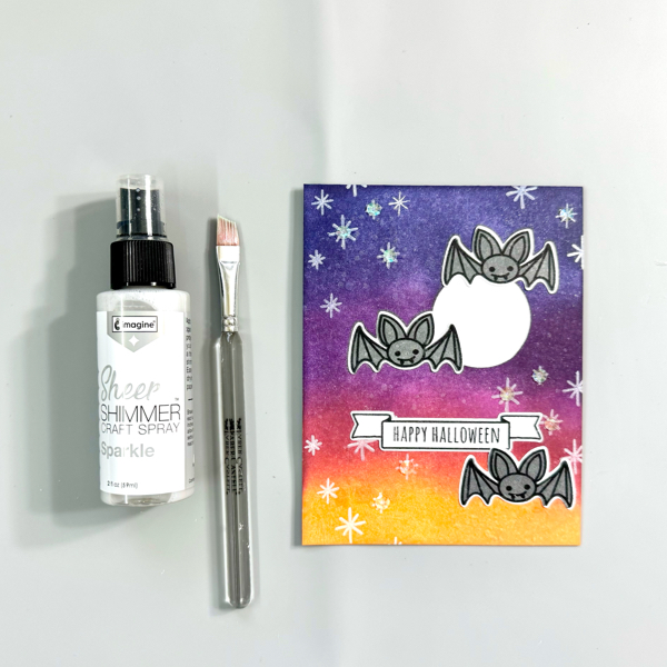For extra shimmer, I added some Sheer Shimmer Sparkle spray on the card with small flat brush.