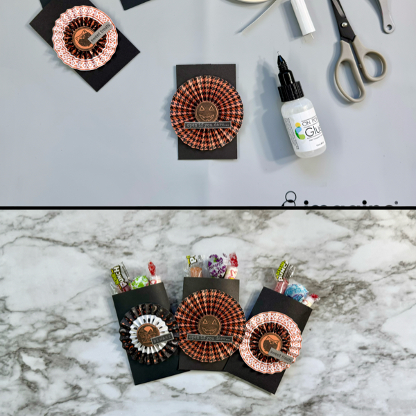 And then add some of the On Point Glue on the back of the pinwheels and add them to the front of those treat bags. Wait a few minutes until the glue to dry well before you fill them up with candies.
