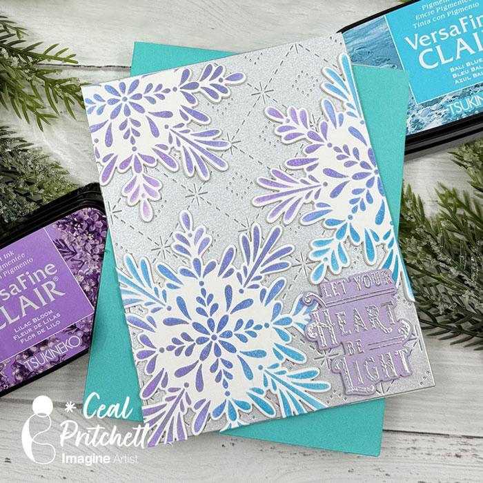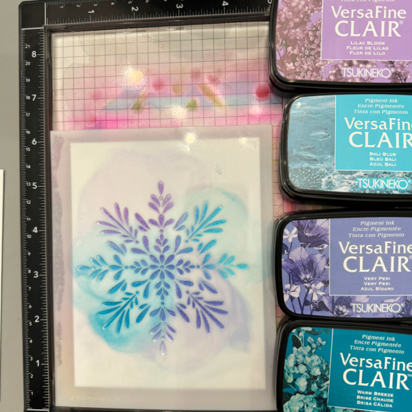 Using a grip mat or another sticky mat, lay your panel on the mat and cover with the stencil. Use several colors of ink to color the snowflake. Repeat this process 3 times.