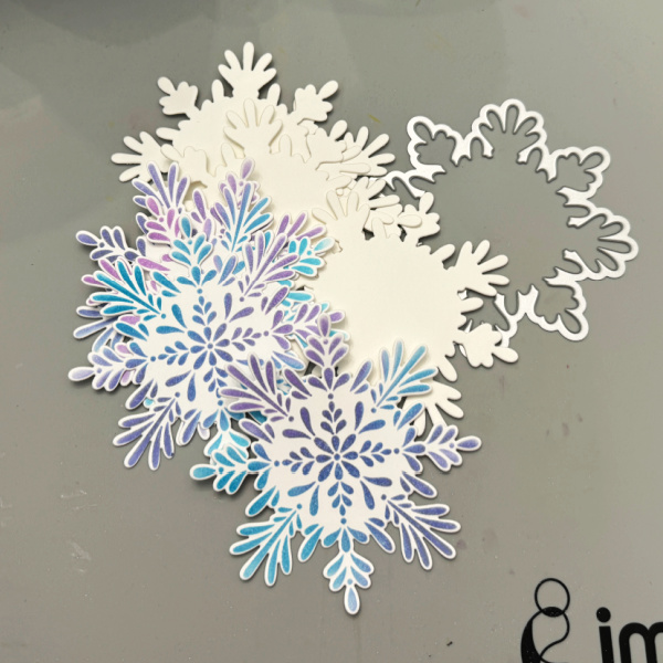 Using the coordinating die, cut out all of the snowflakes you colored along with 6 others out of a heavyweight cardstock. Add the ones cut out of the heavyweight cardstock to the colored ones. This will give you dimension for the snowflakes and will still go through the mail without extra postage.