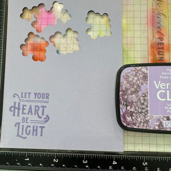 Stamp the sentiment in purple ink and emboss it with clear powder. For my sample I decided to go with embossing it with silver powder on purple cardstock.