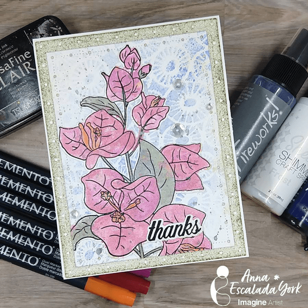 In today’s card, I made a thank you card with some new-to-me Memento markers and sprays.