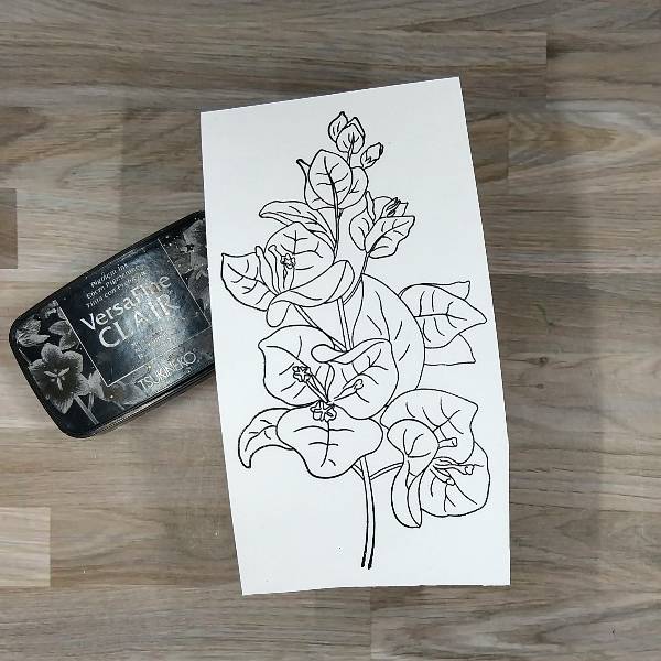 Stamp the large floral image with Nocturne VersaFine Clair Ink on watercolor paper and then heat emboss with clear Mboss embossing powder.