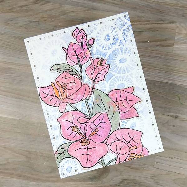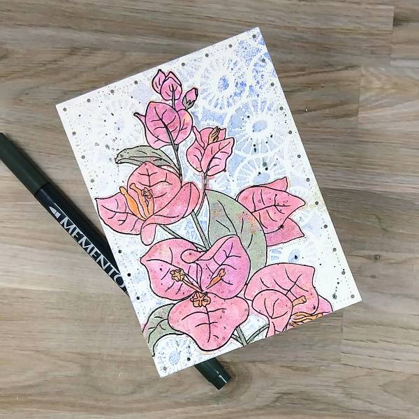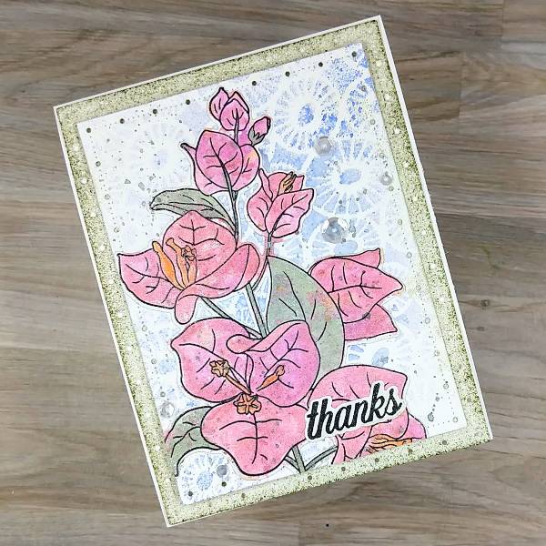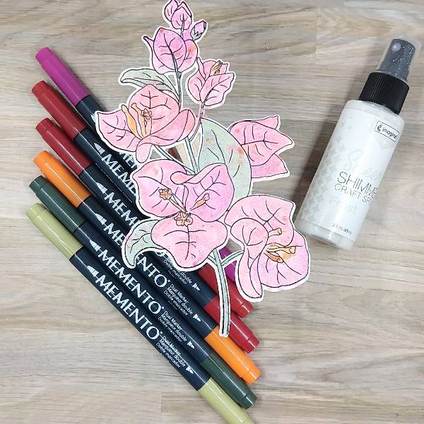 The large floral image was colored by watercolor smooshing a variety of Frost Sheer Shimmer Craft Spray mixed with a variety of colors of Memento Dual Markers–Love Letter and Lilac Posies. After the watercolor smooshing dried, the large floral image was watercolor painted with a Northern Pine and Pistachio Memento Dual Markers mixed with more of the Frost Sheer Shimmer Craft Spray on the greenery. The flowers were colored with a mix of Rhubarb Stalk, Love Letter and Lilac Posies mixed with more of the Frost Sheer Shimmer Craft Spray. Finally, Tangelo Memento Dual Marker was mixed with more of the Frost Sheer Shimmer Craft Spray and watercolor smooshed onto the image.
