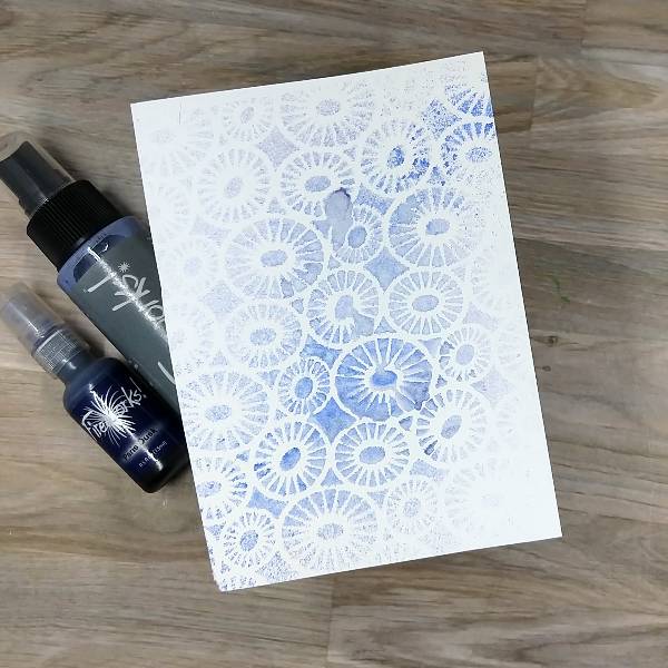 Spray London Fog Fireworks! Shimmery Craft Spray onto another piece of watercolor panel through a stencil. Then spray Paris Dusk Fireworks! Shimmery Craft Spray on a diagonal through the same stencil through the same stencil while the ink was still wet.