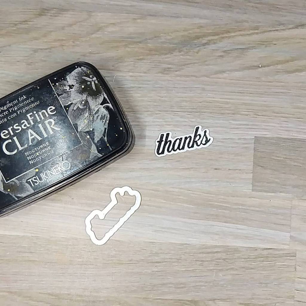 Stamp the thanks sentiment with more Nocturne VersaFine Clair Ink on watercolor paper and then heat emboss it with more of clear Mboss embossing powder. Then die cut the sentiment with the corresponding die.