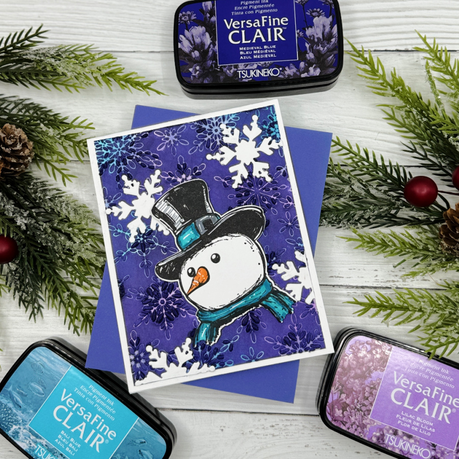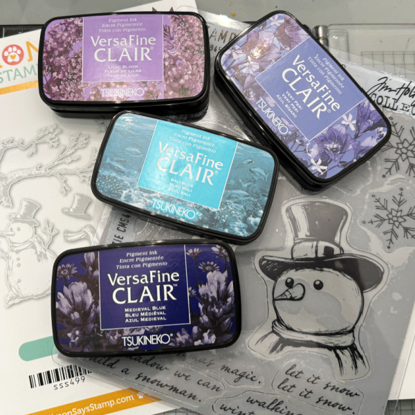 Gather your supplies. You will need 3 softer inks and 1 dark ink. A snowflake 3D embossing folder, a snowman stamp set and coordinating dies.