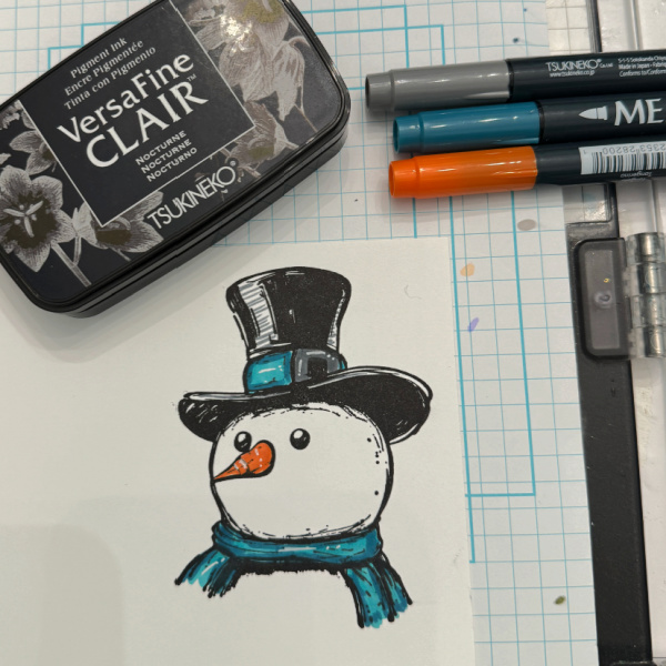 Stamp, color and cut out the snowman image along with some diecut snowflakes. Places the pieces on the embossed panel and add to the card base.