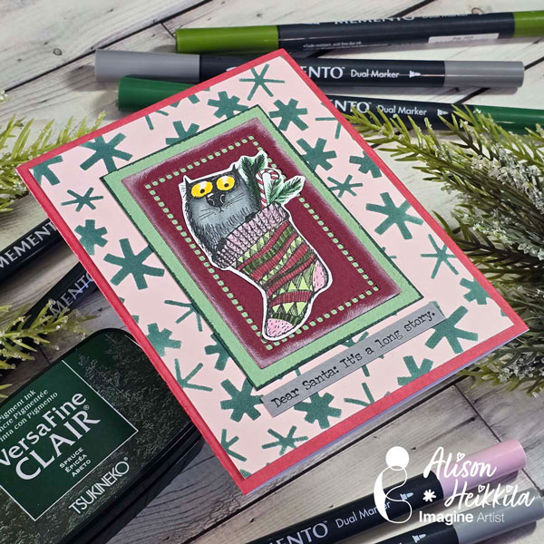 Hello! Alison Heikkila here. It’s time for my latest video for Imagine and I thought it would be fun to show a variety of simple techniques to make a fun cat-themed Christmas card. Plus, we’ll be using Memento Markers. If you’re already a fan of Memento Inks, you’ll want to check these markers out.