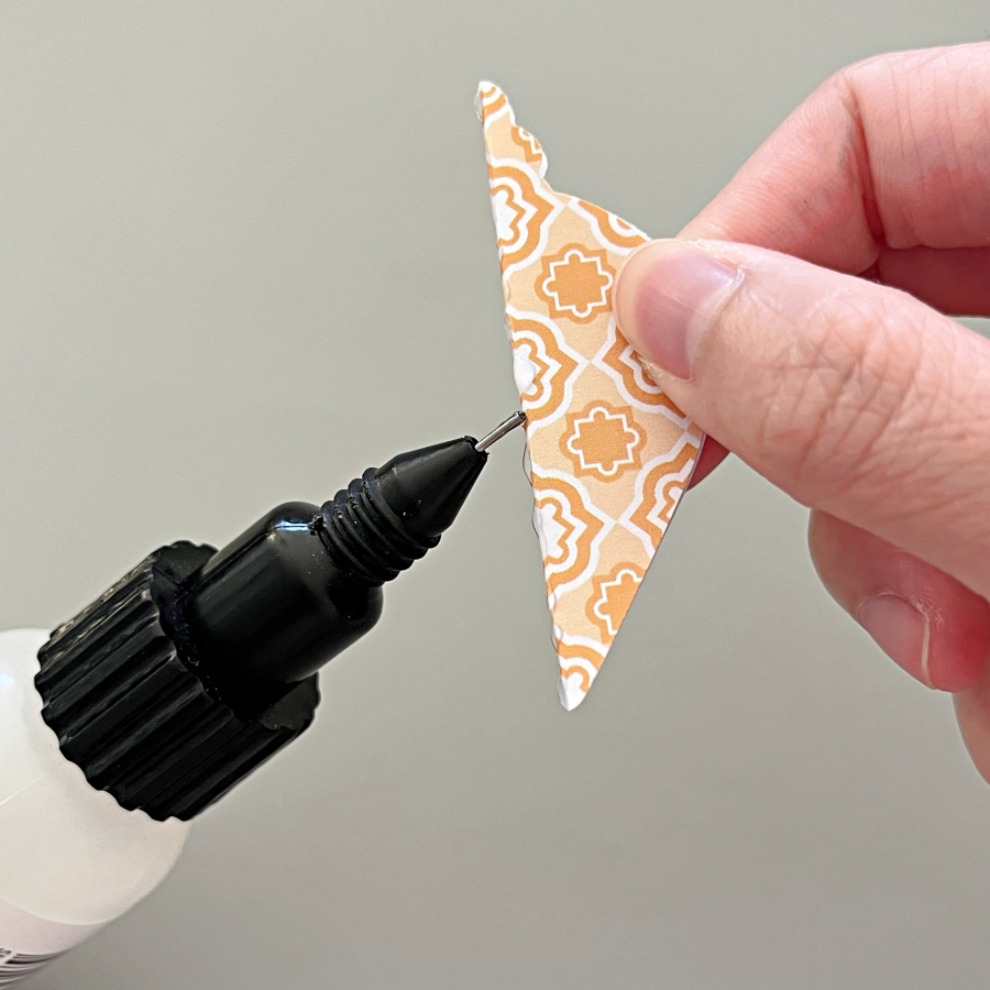 Apply On Point Glue onto the folded crease (backside of the patterned paper) and adhere to the unscored punch piece. Hold in place for 20-30 seconds while the glue dries.