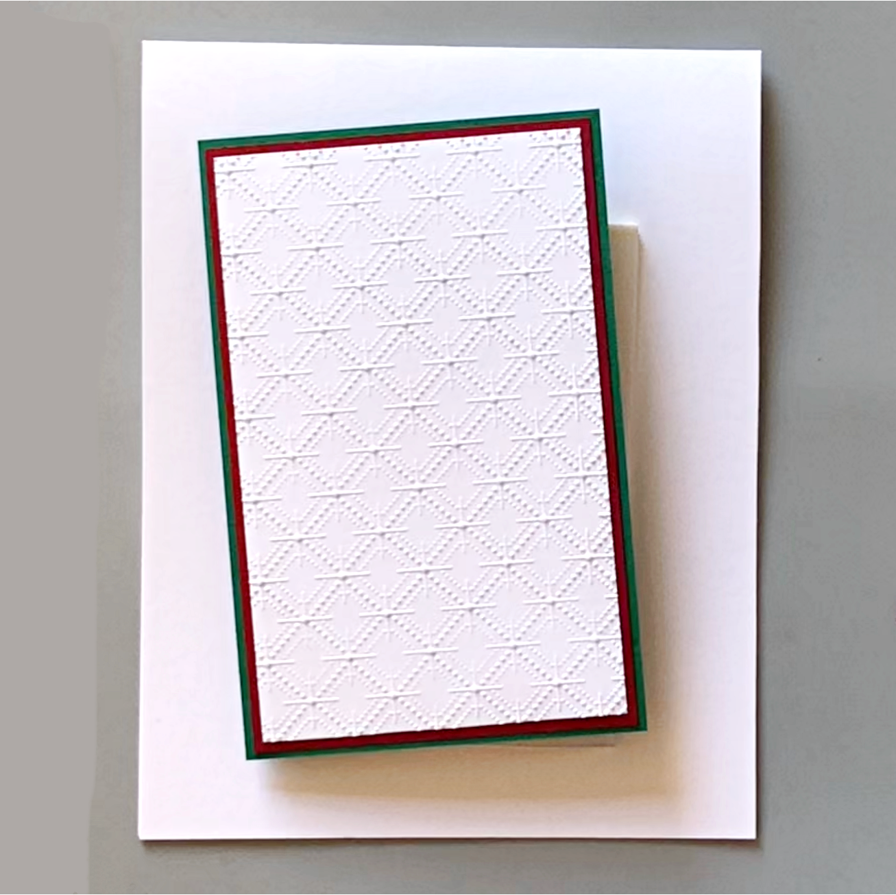 For the second version of the christmas card, I used the negative pieces from the punches and layered red, embossed cardstock underneath. Generously apply the Sheer Shimmer Stix in sparkle to add additional shimmer.