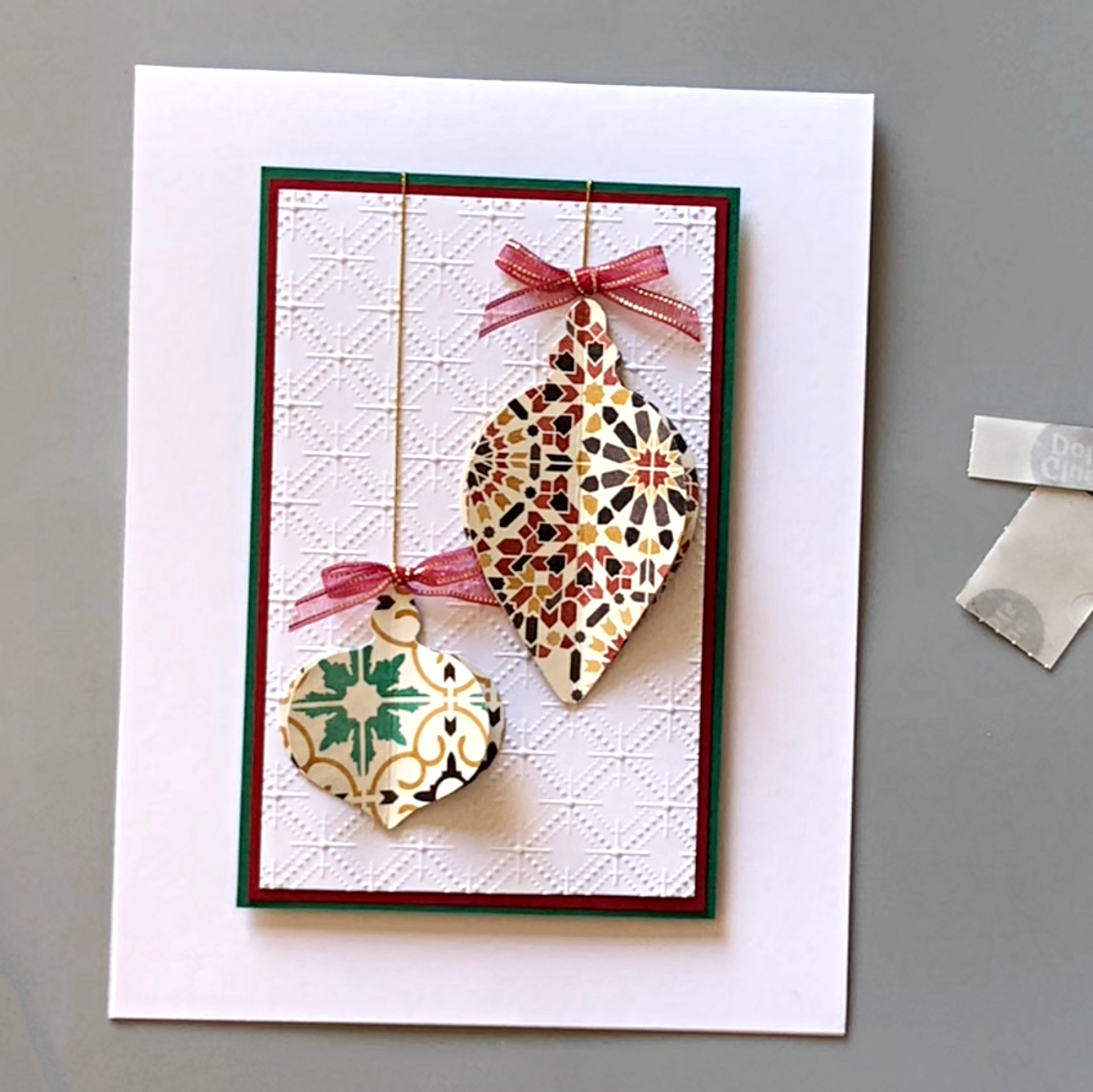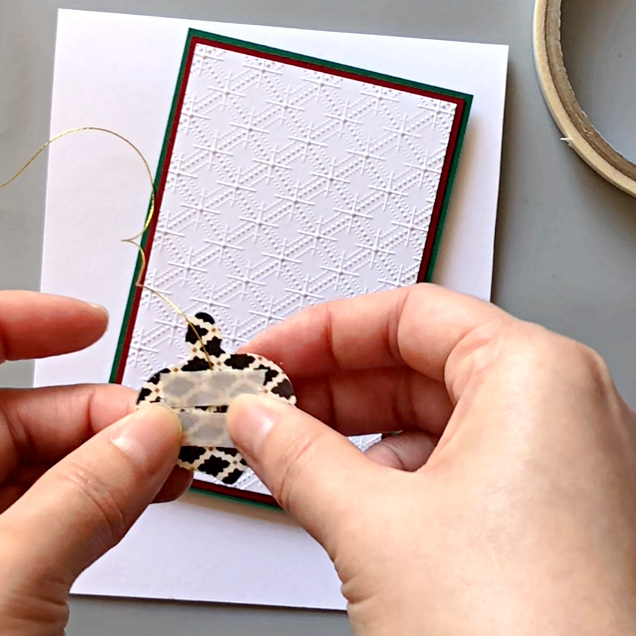Attach a piece of gold thread to the back of the ornament with Tear It Tape, and adhere to the layered background. Attach the other end of the gold thread to the back of the green cardstock layer.