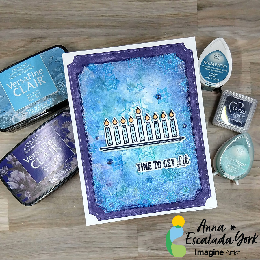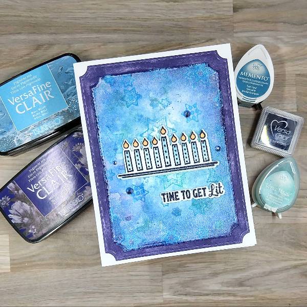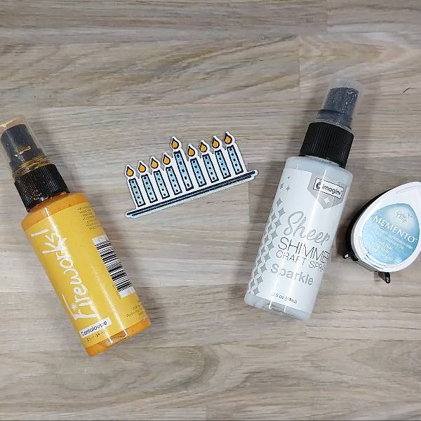 If desired, watercolor the base of the menorah with more of the same Tael Zeal Memento dye ink mixed with Sparkle Sheer Shimmer Craft Spray.
