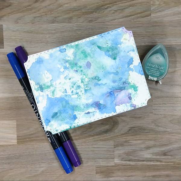 Watercolor smoosh Danube Blue and Grape Jelly Memento Dual Markers as well as Turquoise Gem VersaMagic Chalk Ink mixed with water on a piece of scrap acetate packaging onto a watercolor panel. Allow the panel to dry.