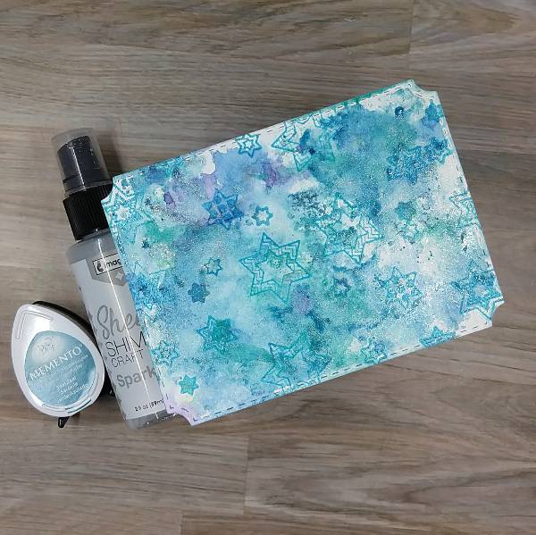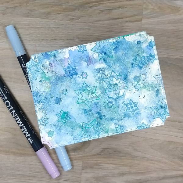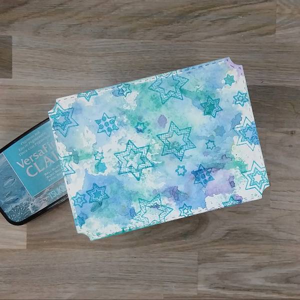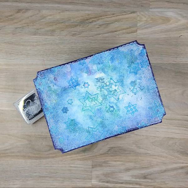 Arrange a variety of six-sided stars onto one side of the watercolor panel in a stamp positioner. Stamp the stars onto the panel with Bali Blue VersaFine Clair Pigment Ink and then heat emboss with clear Mboss powder. Flip the panel and repeat the process. Move any of the stars around on the stamp positioner to fill in any holes on the panel.