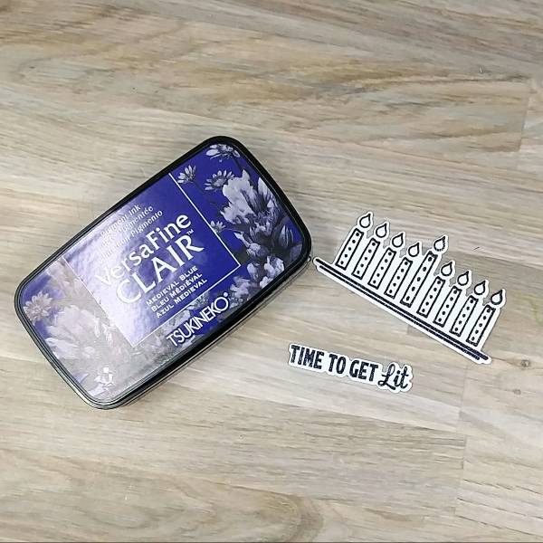 Stamp the menorah and sentiment on watercolor paper with Medieval Blue VersaFine Clair ink. Heat emboss with more clear Mboss powder. Then die cut with the corresponding dies from the matching die set.