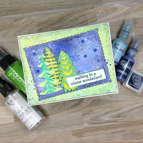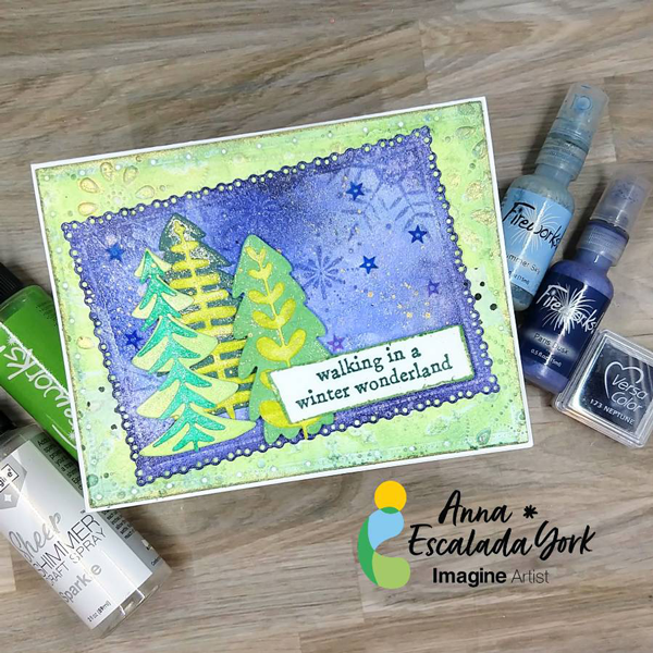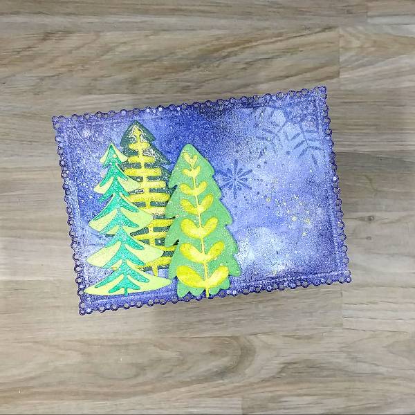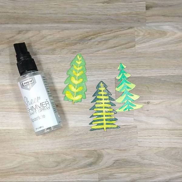 The layers of the dies were glued together. Then Sparkle Sheer Shimmer Craft Spray was sprayed onto more acetate packaging and used to paint sparkle onto the trees.