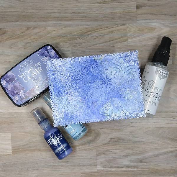 Watercolor smoosh a die cut watercolor paper panel with three sprays sprayed onto a piece of acetate packaging: Summer Sky and Paris Dusk Fireworks! Shimmery Craft Spray as well as Sparkle Sheer Shimmer Craft Spray.