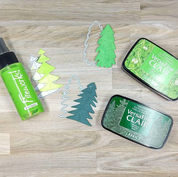 Color small pieces of watercolor paper (or in my case watercolor paper scraps) with a variety of greens: Spruce and Grass Green VersaFine Clair ink and New Sprout Fireworks! Shimmery Craft Spray. The scrap on the left was sprayed multiple times with the Fireworks! Spray and set aside to dry; the two straps on the right were pressed directly into the two ink pads until the whole scrap was colored with the ink. While there was a small space on the dark green tree (on the lower right in this picture) left uncolored, I knew that it would be covered up in the next few steps.)