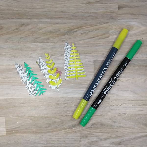 Color three more scraps of watercolor paper with Pear Tart Memento Double Marker and Emerald Fabrico Dual Marker. After the markers had dried, these three scraps were die cut with three more tree die cuts.