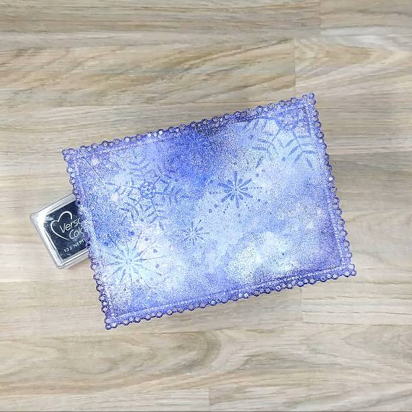 Ink blend the edges of the panel with Neptune VersaColor Ink until it reaches the saturation of color desired. Heat emboss with more of the clear Mboss powder.
