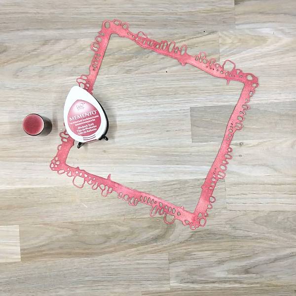 Ink blend the die cut frame with Rhubarb Stalk Memento Ink using a sponge dauber.