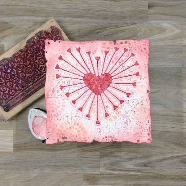 Use a background or texture stamp to to stamp the center of the die cut with ore Love Letter Memento ink. If desired, rub the small hearts around the edge with more Love Letter Memento ink as well.