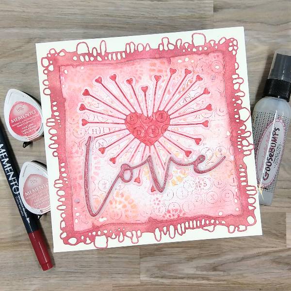 Use the same texture stamp used to stamp the red heart, stamp the background (internal part) of the card base with more of the Love Letter Memento Ink multiple times to add some more interest to the background.