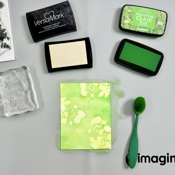 Using a blending brush, add some of the VersaFine Clair Avocado ink to one of the white cardstock panels.