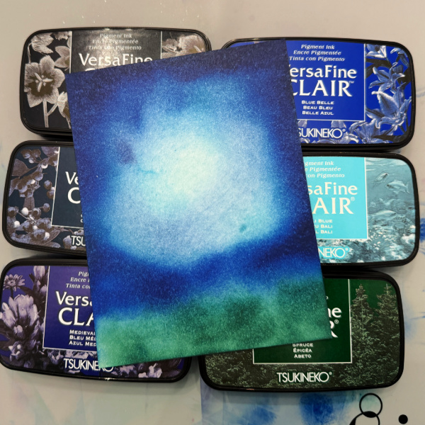 Using a sponge dauber or ink blending tool, blend green ink across the bottom of a white panel cut 4 x 5.25. Next starting with the lightest blue blend a circle in the middle of the panel working your way out, then use the medium blue and the darkest blue last around the outside of the panel.