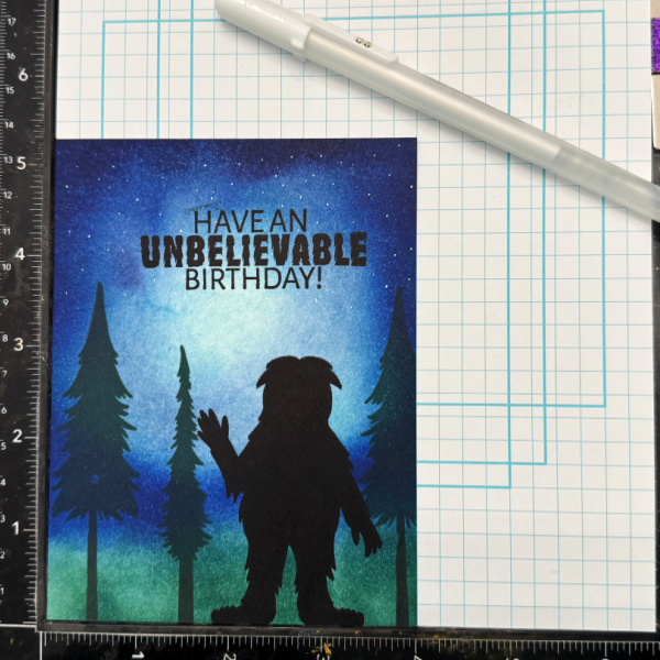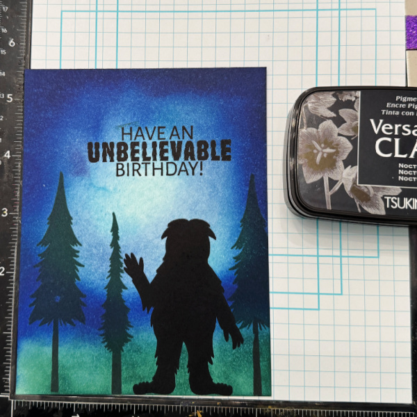 Stamp the bigfoot (sasquatch) in black. I stamped the sentiment when I stamped the trees, but you could actually stamp both the sentiment and bigfoot here since they are both in black.