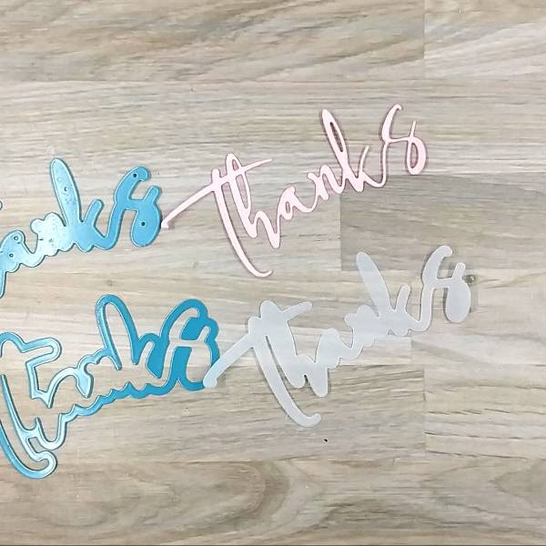 Die cut the pink watercolor paper with a thanks sentiment die and a piece of vellum with the sentiment’s shadow die.