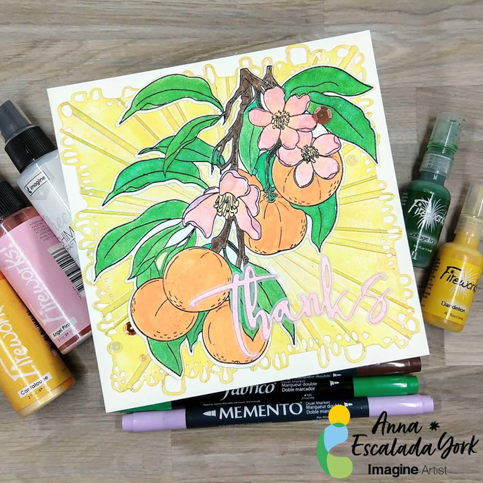 - Electric Orange Radiant Neon Amplify! pigment ink and Cantaloupe Shimmery Craft Spray were mixed on a piece of scrap acetate and was watercolored onto the tangerines.