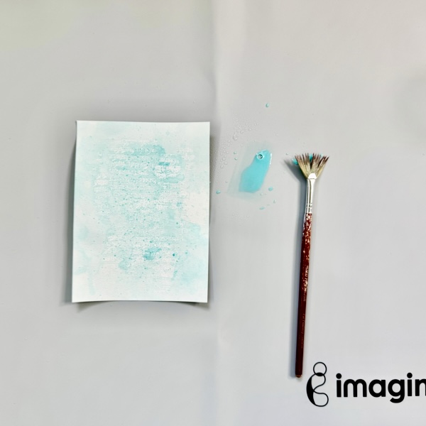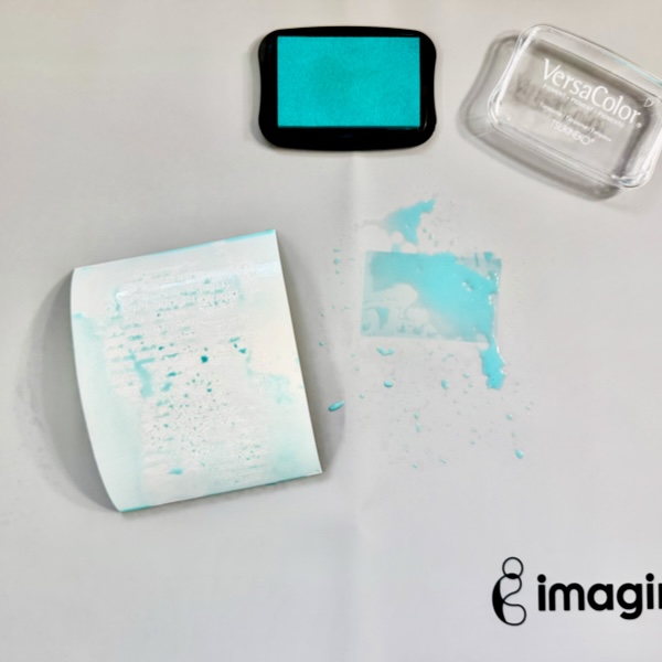 Dab some inks of the VersaColor Turquoise ink pad on the craft mat and then spray with some water. Smoosh the watercolor panel into the ink on the craft mat, dry the ink, and repeat the smooshing and drying the ink as needed.
