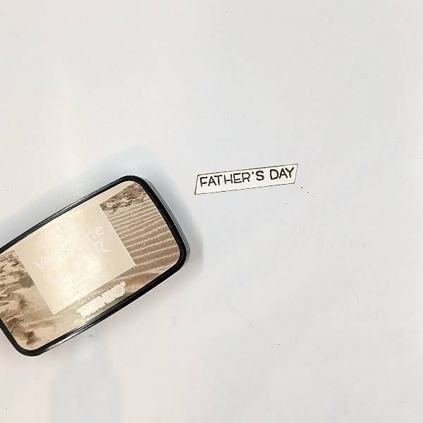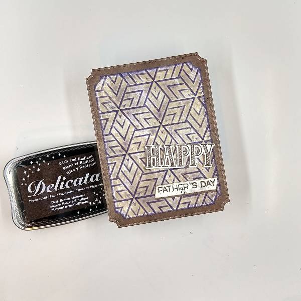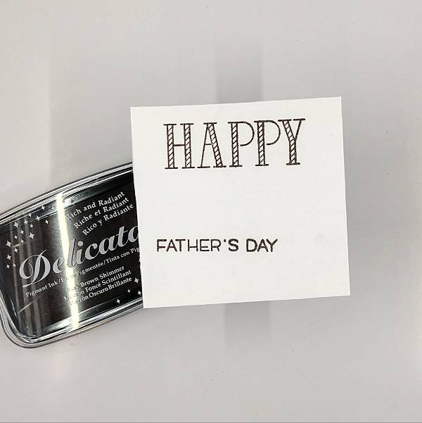 Stamp the card’s sentiments (both the larger “happy” and the “Father’s Day” subsentiment) on another piece of watercolor paper with Dark Brown Shimmer Delicata ink and then heat emboss both of them with clear embossing powder. Set this aside as well.
